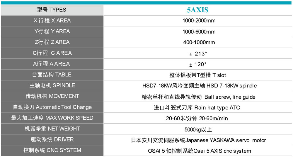 原力五軸加工中心,真正五軸插(chā)補(bǔ)RTCP功能,台灣PMI絲杆和導軌,保證了精細雕刻。意大利HSD7-18KW360度風冷(lěng)變頻主軸電機,機床(chuáng)床身經(jīng)過高溫回(huí)火去應(yīng)力後進行兩次精密加工而(ér)成,屬重切削型加工。床身(shēn)經久耐用(yòng),自動報警功能,自動潤滑係統,意大利(lì)OSAI-5軸控製係統。