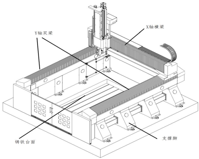 架構整體鑄件(jiàn)而(ér)成,分布合理的筋板,均勻承擔滑板的重(chóng)量。主要由主傳動係統、橫梁、橫梁移動軌道、高速銑頭(tóu)、
